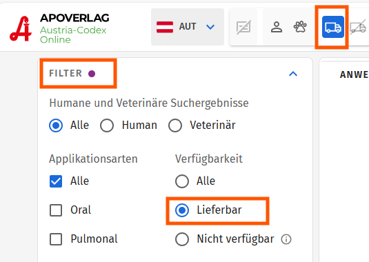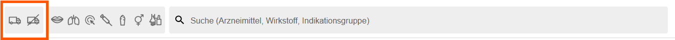 - nur lieferbare Arzneimittel - klick auf lieferbar - das Symbol wird blau hinterlegt und im Filterbereich erscheint ein lila Punkt; Hinweis zu Modul International: Für internationale Arzneimittel wird der Status "im Handel" berücksichtigt.